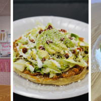 Wheat flour square is topped with cream, lettuce, onions, tomatoes, pickled pork skins, salsa, avocado. Chiccharon prepardo con crema, lechuga, cebolla, jitomate, cueritos, salsa y aguacate.